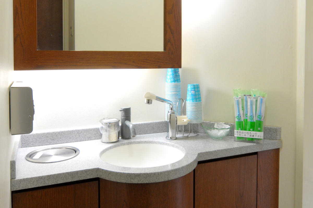 治療室に入る前に、化粧、洗口コーナーがあり、外出先等からお急ぎでいらした方にはこちらで歯を磨いていただけるようになっています。診療後のお化粧直し、身だしなみのチェックもできます。